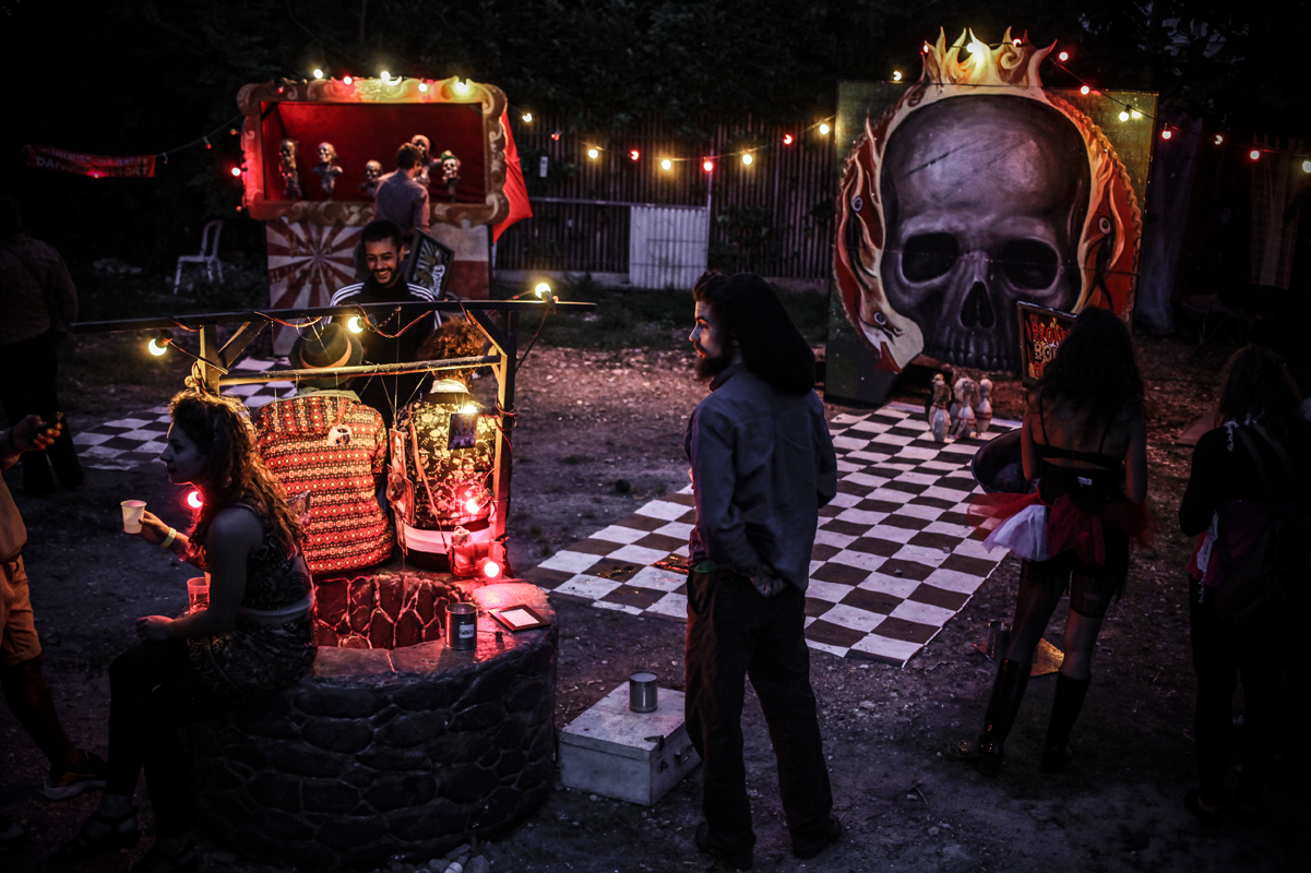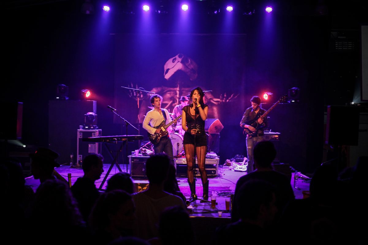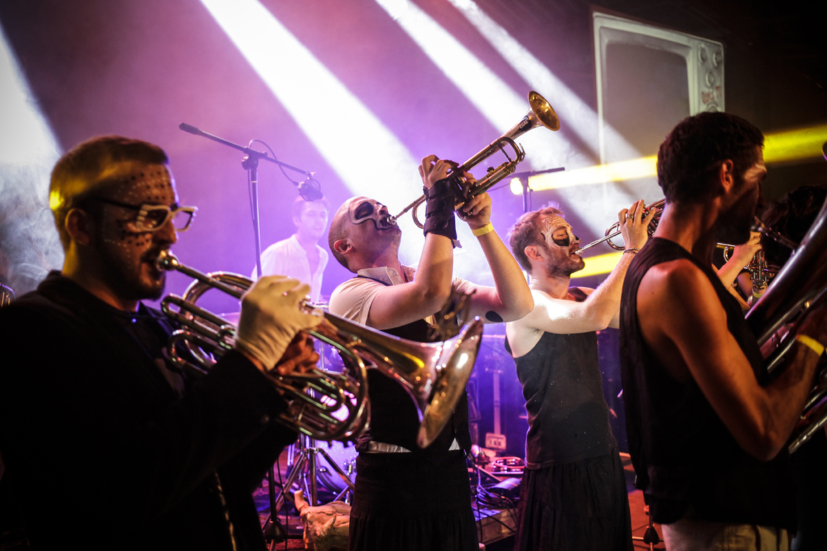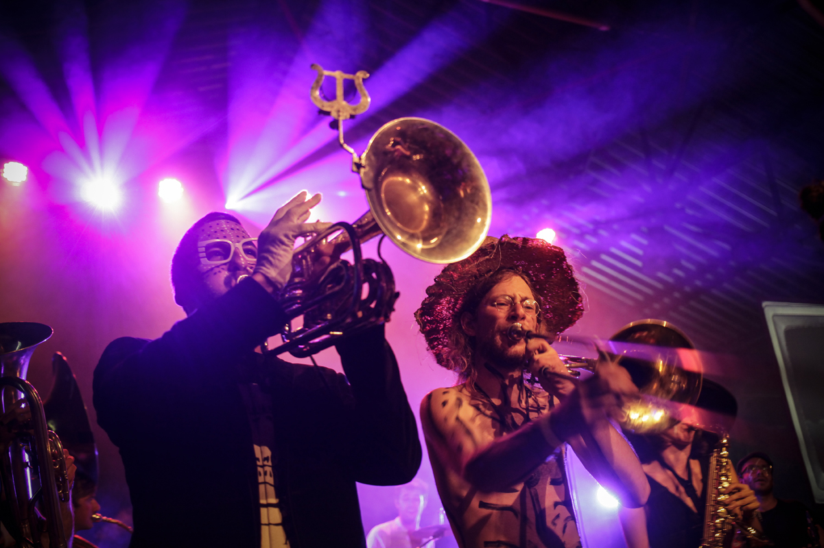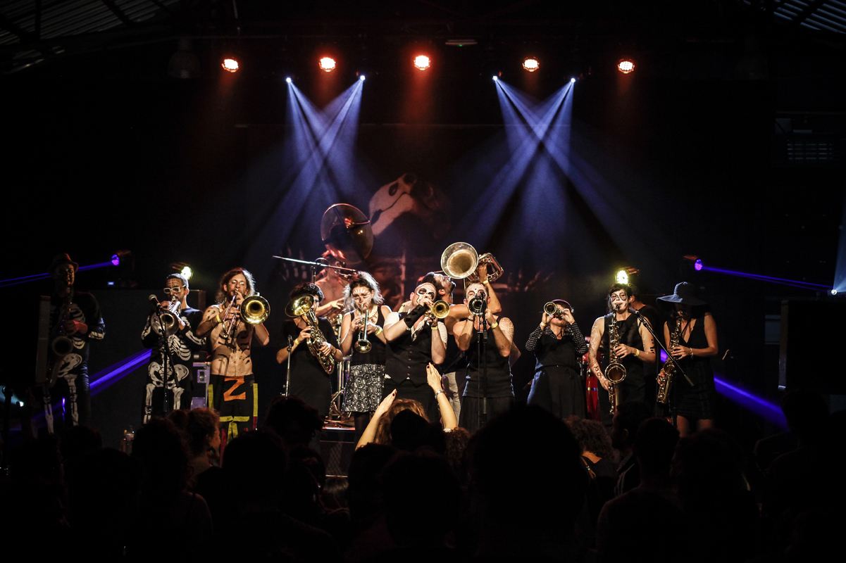 GalerieParler de musique est presque sacrilège. Mais s’il faut s’y résoudre, laissez-nous vous dire que les Frères Zeugma – organe acoustique du collectif – ont mûri leur style dans la fièvre des sortilèges et poussé l’exigence du déhanchement jusqu’à des sommets indécents. À leurs côtés, de nombreux autres groupes peuplent la nuit des échos déchirants de leurs cordes électriques et de l’envoûtement métallique de leurs cuivres.